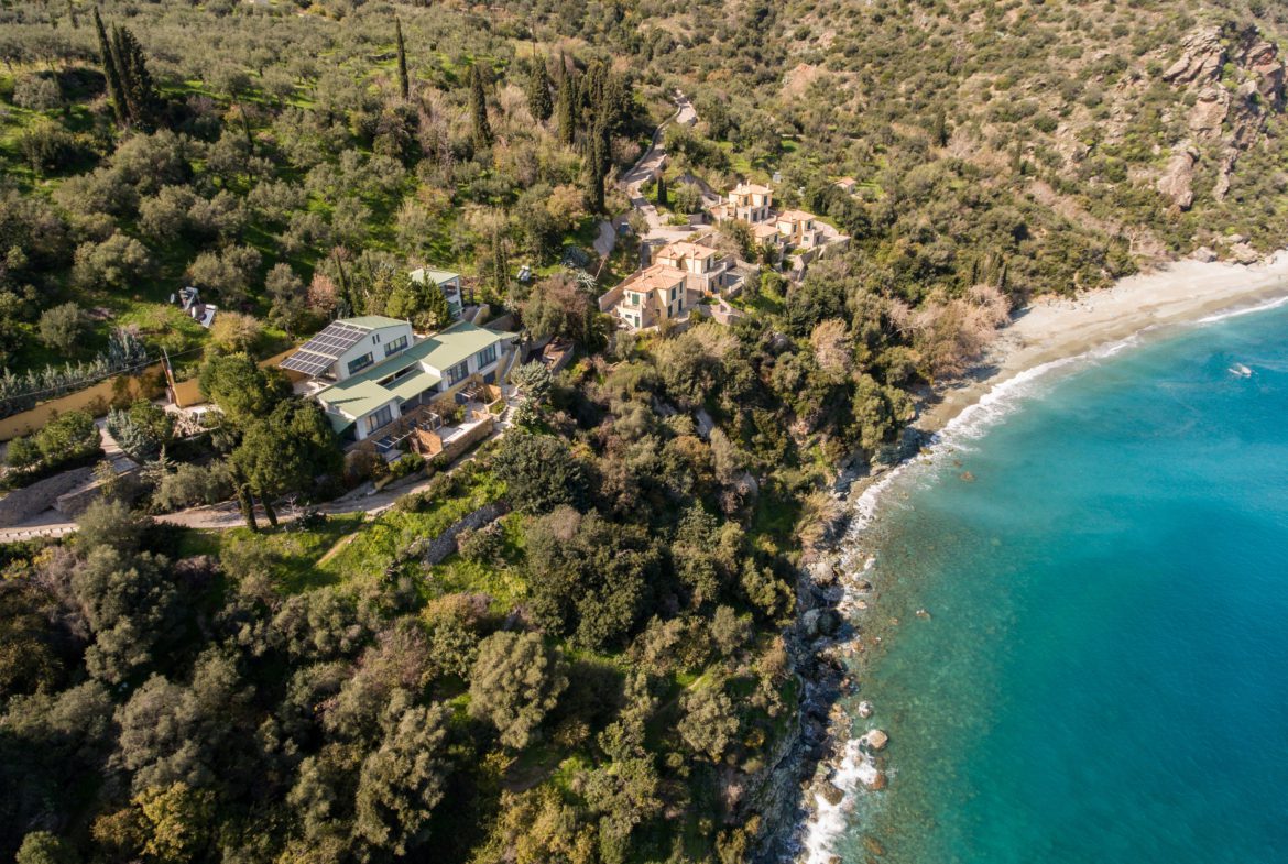 A luxurious house is for sale with a total area of 97 sq.m. in a residential complex which is located in a verdant olive grove of 5 170 sq.m. with a sea view. The house is divided into two levels, built in 2008.