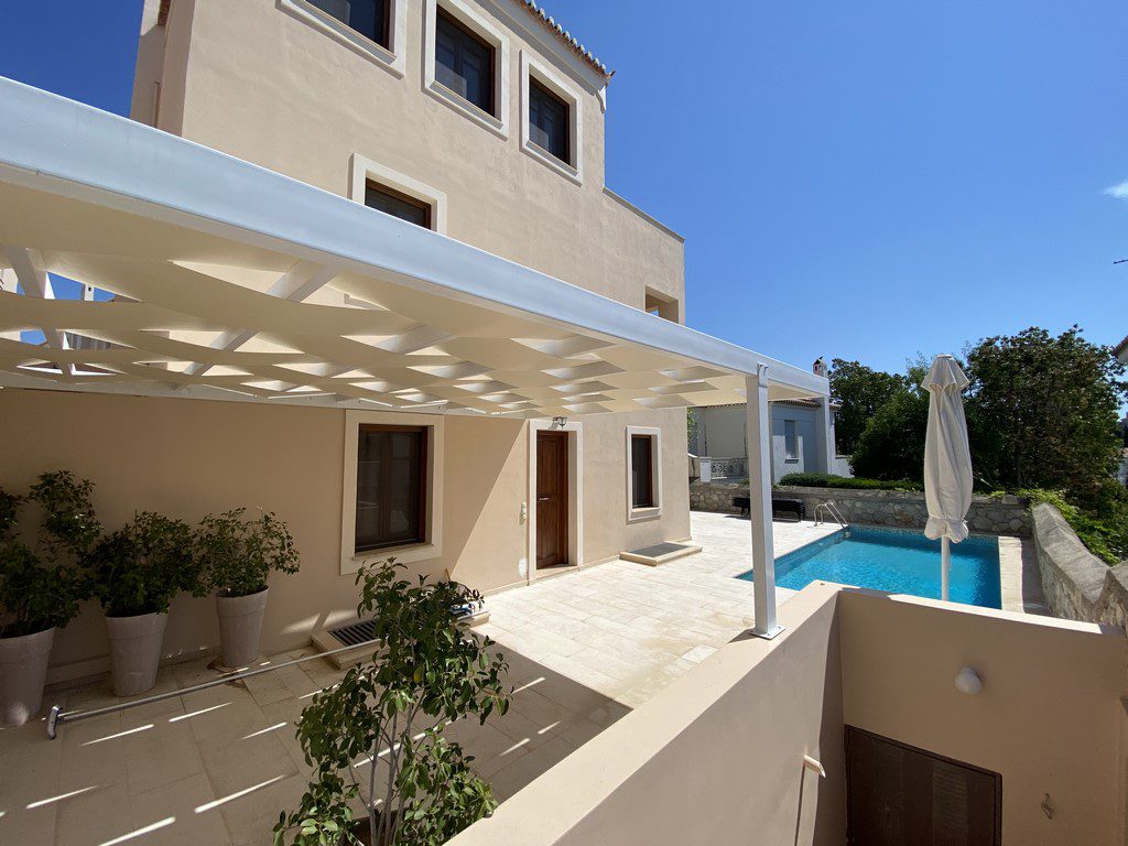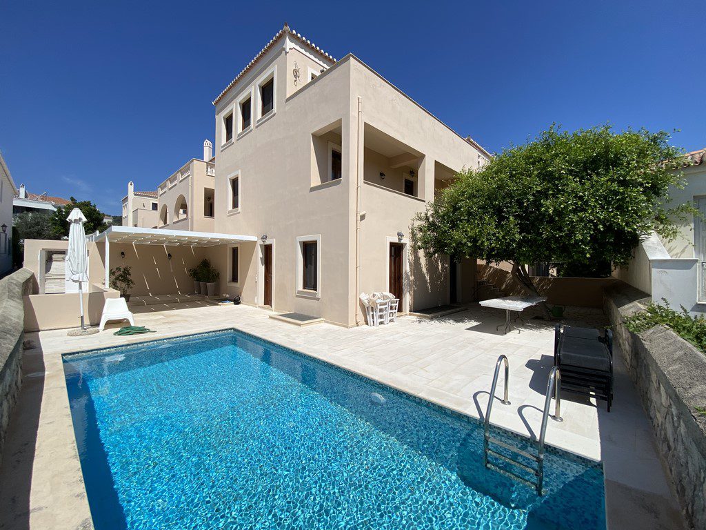 A newly built villa is available for sale in Spetses, Greece.  The villa offers a total area of 304.80 sq.m. and features a private pool with a sea view.  It was constructed in 2009 and is situated in a residential complex within the city of Spetses. The property is located in a quiet area with easy access and occupies a corner plot of 1800 sq.m.