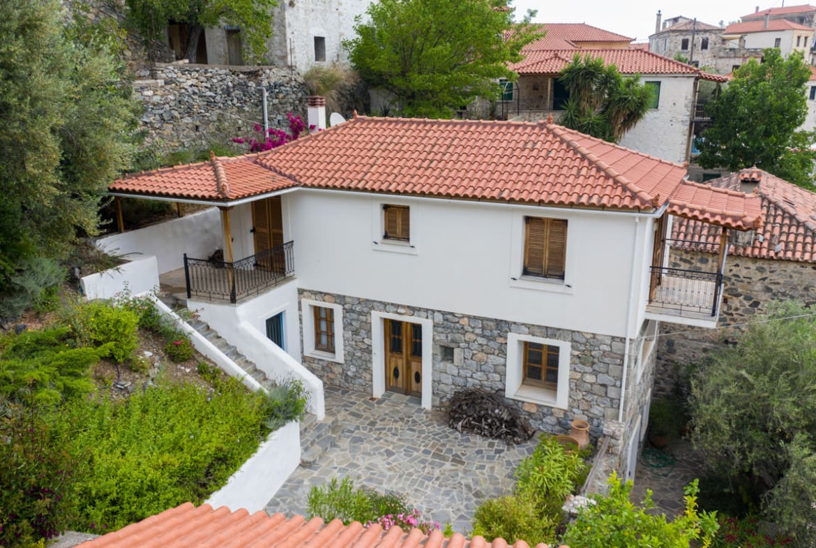 The two lower levels, which constitute the old building, were built in 1910, while the upper level was constructed much later, in 2005, during a complete renovation respecting the architectural character of Pera Melanon.  The lower level features a spacious, fully equipped kitchen, connected to the other levels via an internal staircase.  The middle level consists of a lovely living room with a fireplace, ideal for winter months.  The property is equipped with wooden windows and doors, and also provides air conditioning.  The upper level has a comfortable bedroom with a sea view and another bedroom with its own bathroom.  Additionally, on this floor, there is a second bathroom and storage space.  From the lovely balcony, you can enjoy views of the village and the Myrtoon Sea and the tranquility of the traditional settlement.  The outdoor area includes parking space; moreover, in the lush garden with fruit trees and flowers, there are terraced courtyards where you can spend your time, as well as a storage room.